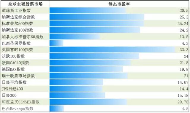 目前全球主要股票市场静态市盈率 ↓↓↓