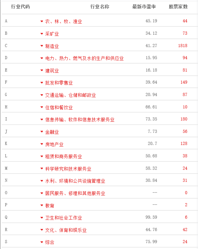 我们再看一下经历了三轮股灾,横盘了半年的A股目前的全市场行业市盈率 ↓↓↓