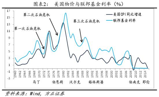 美联储政策风格也是影响货币政策的重要因素。面对第二次石油危机的冲击,1979-1987年担任美联储主席的沃尔克坚决抑制通胀,即使在经济低迷期仍采取紧缩手段。格林斯潘、伯南克和耶伦时期美联储的货币政策目标则相对综合,力图实现增长、就业和物价的平衡。
