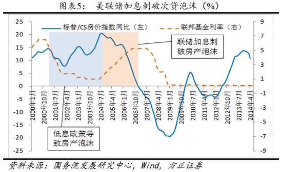 低利率环境在2004年开始逆转,基于对通胀和资产泡沫的担忧,2004年6月至2006年6月,美联储连续17次加息,联邦基金利率从1%升到5.25%。受加息影响,2006年初美国房地产开始降温,房价于2007年初开始下跌。利率上升和房价下跌使美国次贷市场迅速恶化,许多购房者房产净值由正转负,既无力偿付房贷到期本息,又无法再融资。