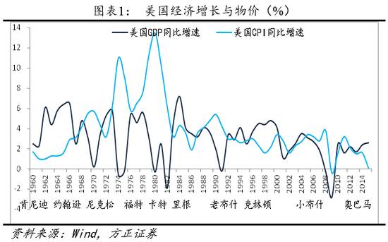 增长、就业和物价是影响美国货币政策调整的主要因素,进而决定着利率和汇率水平。1979年第二次石油危机以来,美国经历了四轮经济周期:1981-1992年间的里根和老布什执政时期、1993-2000年间克林顿执政时期、2001-2008年间小布什执政时期、2009-2016年间奥巴马执政时期。在这四轮经济周期中,除了石油危机等少数时段外,大部分时间经济增长和物价走势基本一致,且物价走势略有滞后。