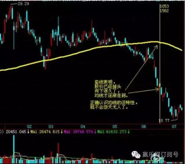 滞后特性–由于是平均值的连线,所以股价原趋势反转时,移动平均线的反映比较迟缓,掉头速度滞后于趋势(均线周期越大,滞后性越强)。滞后性与稳定性是一个问题的两个方面。(见下图)