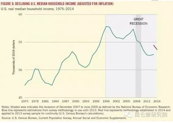 劳动参与率,是经济活动人口(包括就业者和失业者)占劳动年龄人口的比率,是用来衡量人们参与经济活动状况的指标。我们看到,美国劳动参与率1997年达到峰值,此后逐渐下降,甚至在“大衰退”后的所谓“奥巴马复苏”时期仍保持下降趋势,现在大概相当于1982年的水平。劳动参与率降低,人均收入就会下降,退出劳动市场的人口也不再当作失业者来统计。所以,目前美国低到4.7%的失业率并不能说明真实的经济情况。
