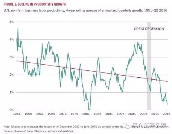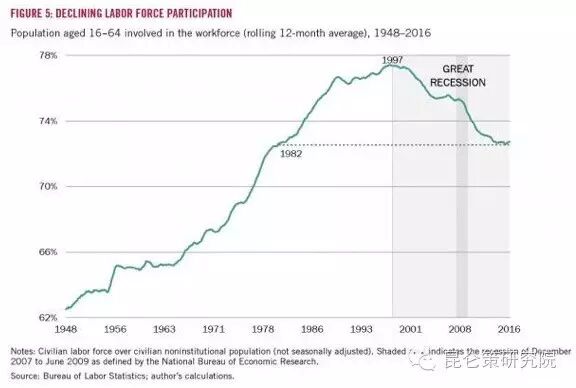 这是1948-2016年美国的劳动参与率变化曲线,灰色部分表示2008年危机时期,他们把这次危机命名为“大衰退”(Great Recession),以区别于1930年代的“大萧条”(Great Depression)。