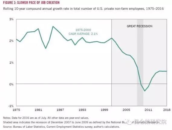 目前工作岗位增长率还未能恢复到“大衰退”之前。