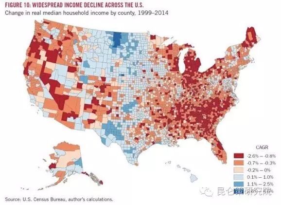 红色表示收入减少,蓝色表示收入增加,越红表示减少越多,越蓝表示增加越多。这份报告的题目提到“一个分化的国家”,我们一看这图就明白了。