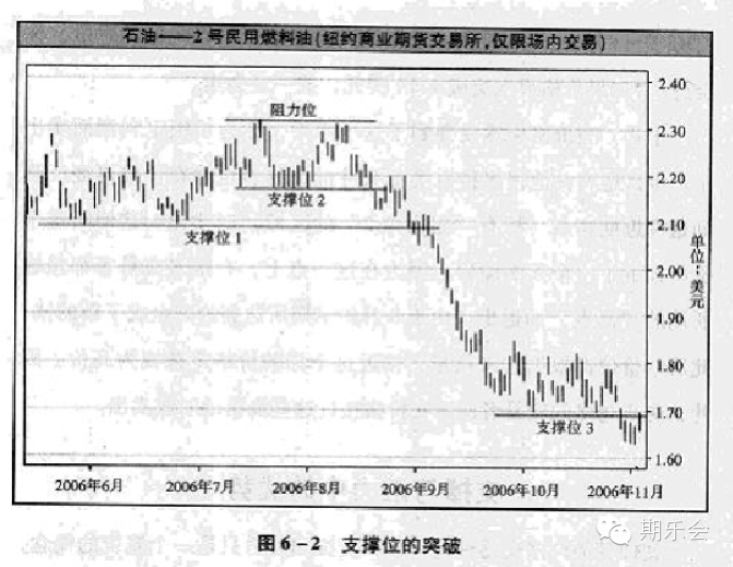 认知偏误形成的阻力与托力,是不可忽视的力量,但并不是全部的力量,任何爆炸新闻、热门评论,都可能影响人们的“信念”,使你相信其他的走势判断,并用行动去支持。下面是2006年下半年石油价格的走势图。下半年一开始,2.10美元成了新的“支撑位”。六月末,这个支撑位接受了第一次检验,七月,第二次检验,都通过了,都有托力让价格乖乖反弹。八月,出现了“支撑位2”,2.16美元,八月中旬,“支撑位2”接受了第一次检验,通过,乖乖反弹;八月下旬,“支撑位2”再次接受检验,市场这时候犹豫了,也许某些消息影响了人们的信念,开始有人觉得价格还会降,而不是升,于是他们不买入,撤掉了一部分托力。当人们发现其他人犹豫的时候,他们也会跟着犹豫,大家都不买,价格很难升回去,我又何必买呢?又有一部分托力被撤走了。于是,“支撑位2“终于失守,降到了“支撑位1”。