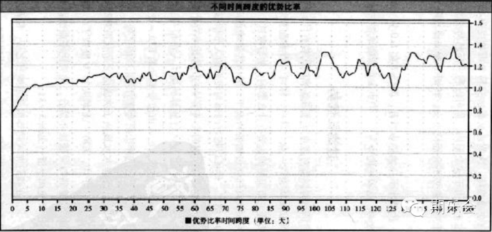 ·随机的市场选“出击点”和“撤退点”:如果不过滤出合适的市场状态,但是按照海龟法则挑选入市时机——只在价格达到20天最高点时入市,E20-ratio变成1.15,E70-ratio变成1.20,胜算也变大了。下面的图展示了“出击点”E-ratio的变化,它有两个特点,第一,一开始小于1,当时间达到一定长度后,E-ratio才升到1以上——这就是为什么要选门当户对的“撤退点”,如果撤早了,很可能会亏损;第二,它的波动较大,并不稳定。