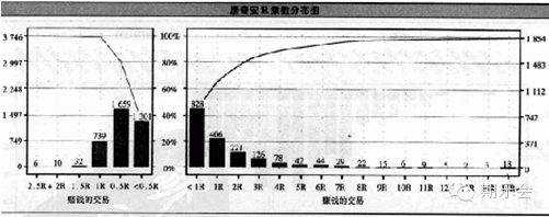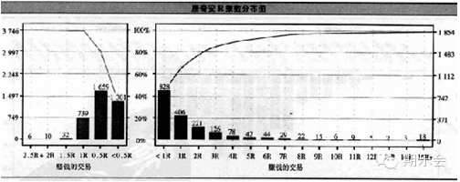 第一,这张图有两个纵轴,左边的是赔钱交易个数,右边的是赚钱交易个数。柱形图上面的左右两条线,是累计加总曲线,曲线的最高处即交易总数。显然,赔钱的交易一共有3746起,赚钱的才1854起,从个数上看,赔钱的远多于赚钱的。