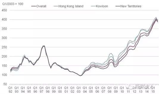 由于政府控制土地供应,而且有大陆房客不断来接盘,除了1997年和2003年经历过一段价格急剧下滑之外,香港的房价总体表现是一直上涨,一直涨,涨,涨,恨不得涨到天上去——当然,2015年开始,香港房价开始略有下跌,到现在都在下跌……