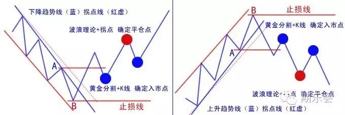 在趋势交易法的应用中,我们用到了以下内容:趋势线、拐点线、分界点A、K线反转形态、波浪理论。