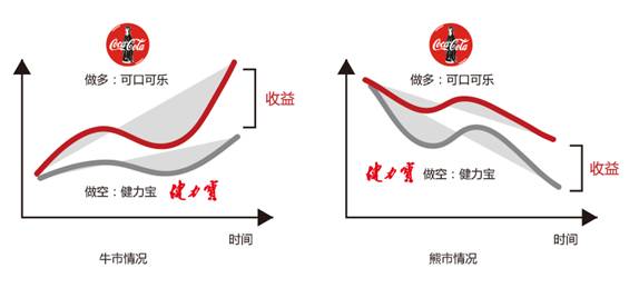 同属于食品饮料板块的可口可乐与健力宝,从历史业绩来看,可口可乐的业绩走势一直好于健力宝。在牛市下,可口可乐的业绩由于好于健力宝,基金经理相信其股价涨幅会超过健力宝,虽然牛市下,健力宝股票上涨,导致融券卖空健力宝亏钱,但是可口可乐的涨幅带来的收益能超过这部分的亏损,最终差值即获得的绝对收益;熊市下,相同的操作方法,由于可口可乐的业绩好于健力宝,健力宝的股价跌幅大于可口可乐,融券卖出健力宝的收益超过做多可口可乐的亏损,二者的差值便是正的绝对收益。