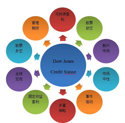 由于涉及的金融衍生品繁杂,对冲基金的具体策略种类繁多、跨度巨大,不同机构也有不同的分类方式。根据瑞士信贷对冲基金指数,大概可分为以下10种策略方法。