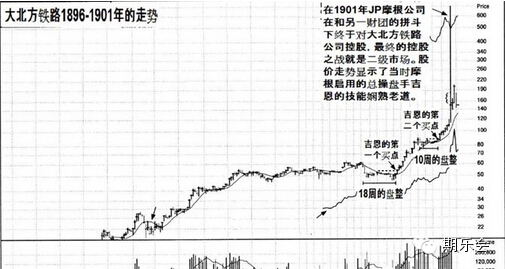 我从复原后的伯利恒钢铁的股价走势图中可以看到,李佛摩尔从看好伯利恒钢铁上涨之时开始选股,在耐心地等待和观察中煎熬等待了超过6周的时间,于自己完全确认该股要继续上涨的时候开始操刀买入,一击成功。通过这个复盘和解盘,在1994-1995年我再次对1895-1902年大大北方铁路股收集了资料进行复盘和解盘。研究了比李佛摩尔更早一辈的JP摩根御用总操盘手詹姆斯吉恩当年为摩根控制该铁路股的操作发现,这两档股票的走势居然有着承上启下的雷同。