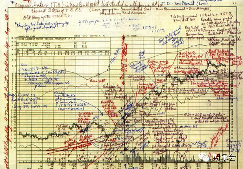 这里展示2份我的恩师欧奈尔在1958-1961年买入布郎斯维科和1962年操作克莱斯勒当年这两只超级牛股时候的手稿,我在这里展现给大家参考和思索。这是他当年在交易的时候标注在K线图上为什么买入,什么时候买入和买入条件,以及加码或者继续持股的手记。欧奈尔的方法源自与1955年后美国最出色的第一代基金经理人杰克卓法斯,我只买最强势的股票。卓法斯基金当年以5000万美元起家,整个基金管理团队只有三个人,老卓法斯和他的两个画K线图的助手缔造了美国基金业的神话。我认为无论是李佛摩尔的要素,还是卓法斯的方法,抑或欧奈尔的精髓,都是值得我们这些后辈传承、学习和融合的。只有站在巨人的肩膀上,我们才能看得更远,更高。
