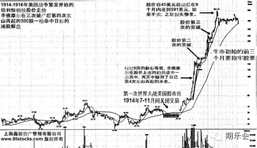 aaa由于1914年8-12月中,华尔街闭市,在进入1915年2-3月,李佛摩尔当时已经看好因大发战争财的伯利恒钢铁公司,那时候该股股价50美元左右,但对比大盘,道琼斯工业指数当时还没有显示强度,只是领导股出现了牛角尖。李佛摩尔坚持了耐心,期间到了1915年5月下旬,道琼斯的牛市强度开始了,而在伯利恒钢铁股价于6月初开始冲天而起3周内股价到90美元以上进入了李佛摩尔早年多次成功的“过百”经验之中,而他的成功股价过 100就会继续上攻的信心给予了他从98买入,而在145美元卖出,仅仅只要两天的时间就成功的机会,为了两天,他耐心苦候了6周。这是华尔街给予他的耐心和经验的回报,从一个破产的人,到刹那间恢复了所有的成功交易信心和股本,他用超过6周的耐心和等待,而博浪一击的成功操作仅需2天就完成了结果。由此可见,事实上对于职业投资者,心理和经验的齐缝配合才能真正找对市场的大波动方向。