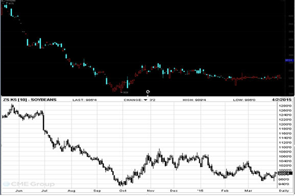 国内的大豆有两个品种,豆1和豆2,豆2是转基因,海外的大豆几乎都是转基因大豆,因为美国转基因大豆是主流,一样的,它们的价格走势非常好。大豆的下游产品豆油一样的,国内的豆油期货价格走势跟国外豆油期货价值走势是一模一样的(图3)。