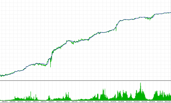 那时候我就在想,原来的策略是完全没道理的,因为它就是把相关性当做了因果,把频率当做了概率,尽管利用了大量的数学手法和计算机编程,它只是一种高科技迷信,本质上跟电脑算命并没有区别。电脑刚出来的时候商场里面有算命机,取代算命先生,电脑算命还是有道理的,我把频率当做概率,把经验当做因果,尽管我动用了大量高科技的手段,但它只是一种高科技迷信,它背后没有任何道理。既然做坏了,所以我想要精准的因果,我就去思考汇率的本质是什么,我发现一个事实,WTO零关税之后汇率成为实际意义上的关税,我不知道大家能不能理解。比如说以前人民币跟美元1:8,出口1美金的东西能赚8块钱,现在1:6,出口1美元的东西只能赚6块钱了,事实上关税就提高了,因为我能赚的钱变少了,事实上汇率就是一种关税,尽管他说现在没关税,但汇率就是关税。过去财长每年都要进行关税协定,这从春秋战国开始就是这样,现在没关税了,意味着什么?但它还是不能瞎走,所以汇率意味着真正的关税协定,汇率必须保持利益之间的平衡,汇率是真正意义上的关税,而关税必须保持联动,所以汇率也必须保持联动。请问我这是一个经验概括还是客观事实?它是客观事实,它是演绎法,而不是归纳法。于是我从历史数据中找出汇率失衡的极限忍受范围,这个是演绎法还是归纳法?这个是归纳法。我动用了可以利用的所有资产类资源,公司里面任何一个CPU我都没有放过它,顶着无数的压力,我把所有员工的计算机全都装上了我自己写的软件,没日没夜地跑,以至于他们卡的什么都开不了。我把所有能够动用的CPU全都买回来了,那时候看到CPU眼睛就放光,因为那个计算量实在太大了,最后动用了一些妥协的算法,我们得到了这么一个策略。现在得到漂亮的历史回测,已经不会像年轻的时候那样心动了,掌握教训了,这(图8)个策略最后是这样。我们可以看到它有明显的回测,尽管策略里面没有包含任何宏观方面的信息,但它忠实反映出了历史上的一些重大事件。
