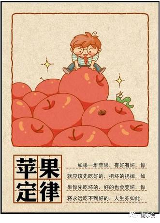 1、苹果定律:如果一堆苹果,有好有坏,你就应该先吃好的,把坏的扔掉,如果你先吃坏的,好的也会变坏,你将永远吃不到好的,人生亦如此。