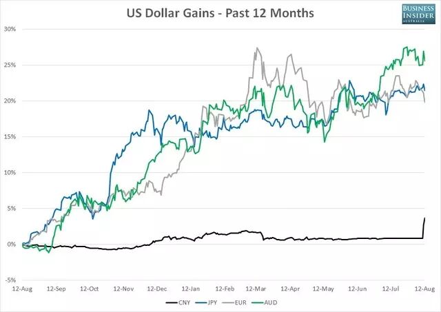 更为明显的受害者则显然是亚洲国家的汇率以及其他一些和中国有密切关系的新兴国家货币。无论是马来西亚还是巴西,都难以承受“人民币贬值之重”。