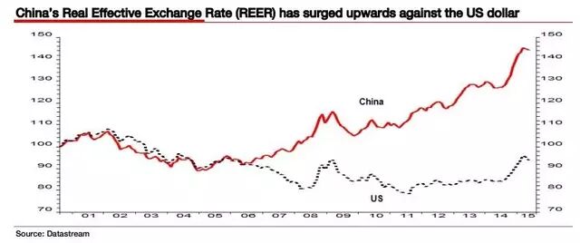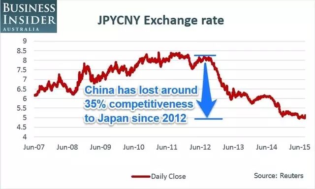 对于经济体量更大的国家来说,这一原则也没有太大的变化。比如为了刺激经济和出口,安倍晋三上台之后就通过各种方法将美元对日元的汇率从2012年9月的80水平拉高至了125。换句话说,日元在3年内贬值56%。相较于日本,由于人民币此前的坚挺,中国实际的竞争力在2012年之后下滑近35%。