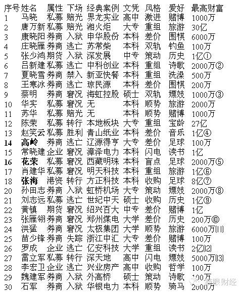 公司系的代表有汉龙集团的刘汉、刘坤,宏达集团的刘沧龙,三读集团的张少鸿,上海邦联集团的徐涵江,北大明天系的肖建华等;私募系的有最早期典型操纵界龙实业的马晓,登峰造极的德隆系的唐万新、高江,恶炒青山纸业的股评家赵笑云,坐庄西藏明珠的花荣等;券商系有操盘琼民源的广发证券王寒冰,操盘辽源得亨的辽国发高岭,操盘粤电力的西北证券原总裁马世兵等。诸如在后人看来也是炒股暴富的天发企业的龚家龙、中路集团的陈荣等人,在这份名单上显得平淡无奇。