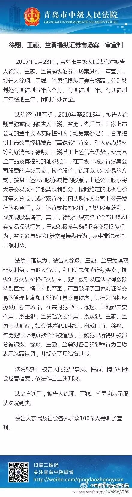 1月23日,青岛市中级人民法院开庭宣判,现年40岁的私募名人徐翔被判有期徒刑五年半,罚金110亿元;此外,今日与徐翔一同审判的还有王巍和竺勇,前者被判有期徒刑三年、罚金10亿;后者被判有期徒刑两年,缓期三年,罚金5000万元。