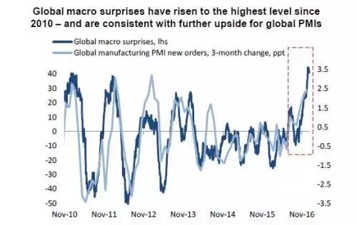德银欧洲股票策略师Sebastian Raedler在看到1月的PMI初值之后表示,虽然全球增长势头触及六年最高水平,全球宏观意外指数更是升至45,创近七年最高,逼近峰值。