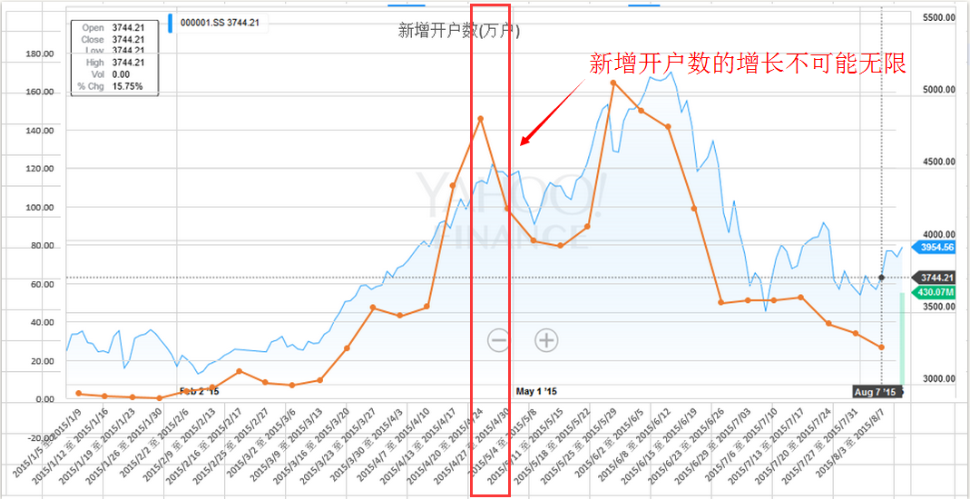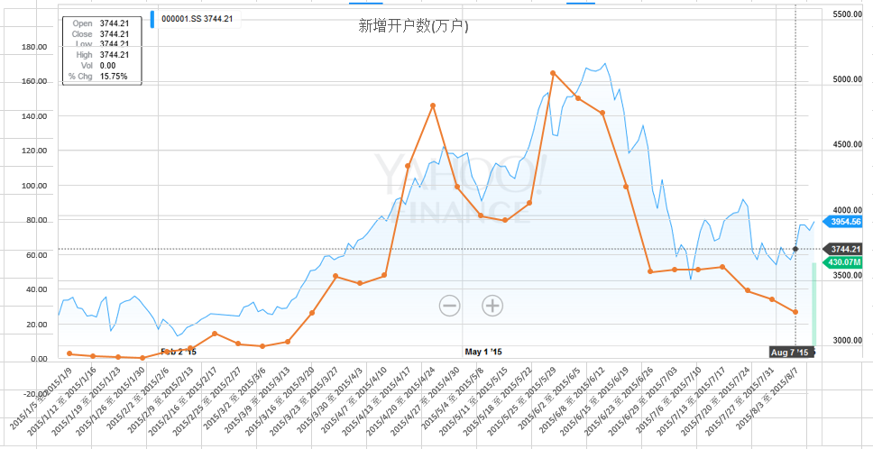 蓝颜色的是股市的指数,橙色的是新增开户数。