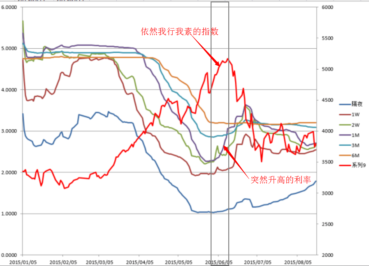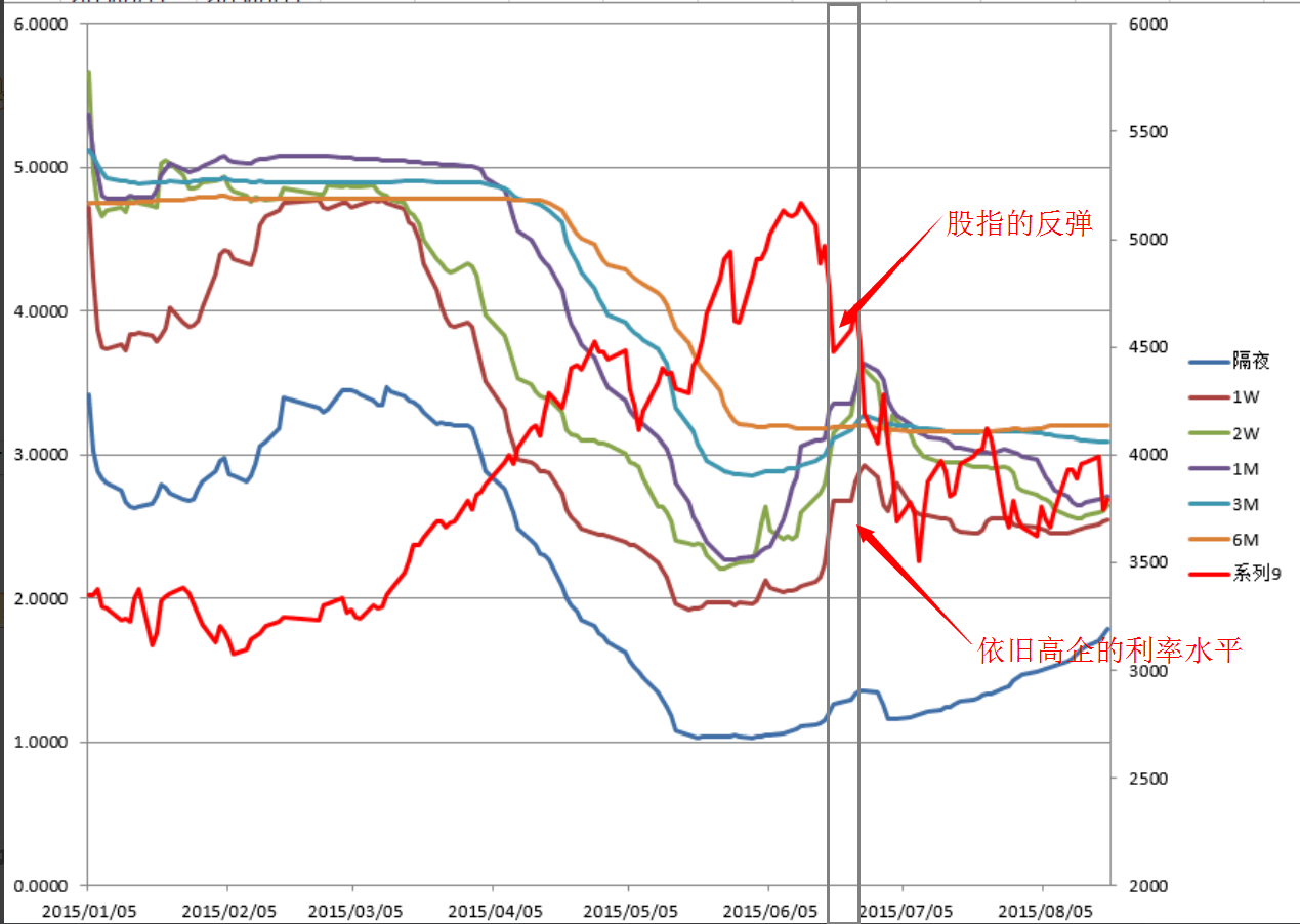上图里的红线,是上证指数,其余各色的线,是Shibro各个时间周期的利率。我们可以看到利率下降得非常坚决。特别是出现大跌的时候,本已经下降得厉害的利率进一步下降,坚决程度罕见。