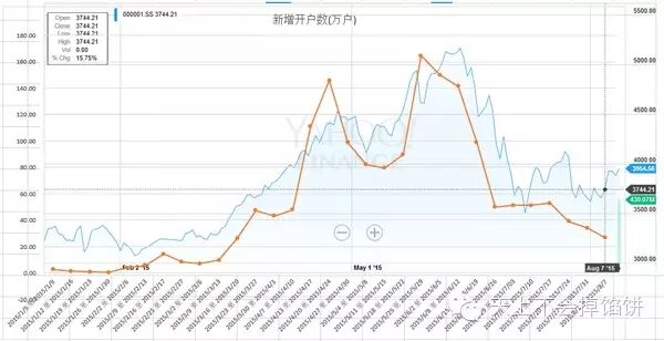 蓝颜色的是股市的指数,橙色的是新增开户数。