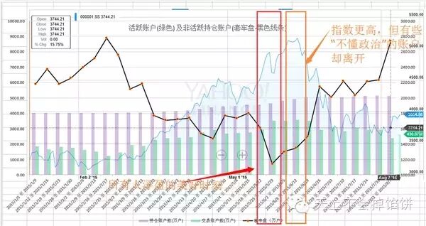 黑色的线是活跃账户的比例。股票账户不是所有的都一直交易,有大量的套牢账户,因为不肯割肉,而一直装死。