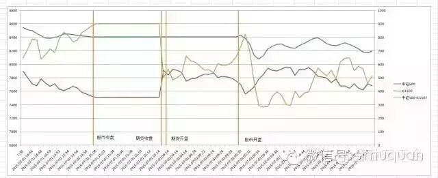 最近现货失真的主要原因是股票大量停盘,又经常大面积涨板或者跌板,指数严重失真。以至于有段子调侃:市场全部涨(跌)板,幅度5%,大盘被ST。结果是一半停牌,一半涨(跌)板。大盘指数涨跌的最大幅度居然是5%左右,这是一个非常离奇的偏差,大盘指数居然可以偏差5%。这个问题,相关股票交易所需要尽快解决。而期货则继续10%的幅度变化。如7月8日,IC1507对中证500贴水近700点,看起来非常大,按照7月7日晚发布的公告,市场有超过1200家上市公司停牌,超过市场股票总数的40%。7月9日更为夸张,停牌数量达到1424家,超过总数的50%。现货指数已经产生严重偏差,而期货价格要预估未来价格变化,要预测停复牌股票对指数的影响,当然要和严重失真的现货指数分道扬镳,坚持发挥其发现价格的功能。