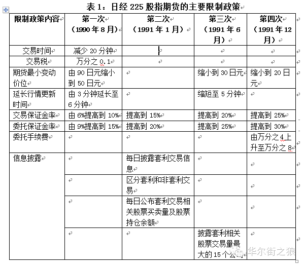 为满足“降低股指期货交易,提升股价”的要求,1990年8月起,在日本大藏省的指导下,大阪交易所不断提高各种限制措施,为日经225股指期货踩急刹车:一是迅速提高保证金水平。在经历四次提升后,日经225股指期货的委托保证金率从最初的9%上升到30%,交易保证金率从最初的6%上升到25%;二是增收交易税,对股指期货交易征收万分之零点一的交易税;三是缩小股指期货的报价区间,增加行情揭示时间,以降低套利交易的利润;四是缩短股指期货交易时间,上午交易时间定为9点至11点(缩短15分钟),下午交易时间定为13点至15点10分(缩短5分钟);五是手续费翻倍,交易费用从原有的万分之4左右的水平大幅上升至万分之8;六是逐步公开会员套利交易情况,开始每天向全市场公布会员的套利交易总成交量,并公布前15名结算会员每周和每日套利交易的成交量。