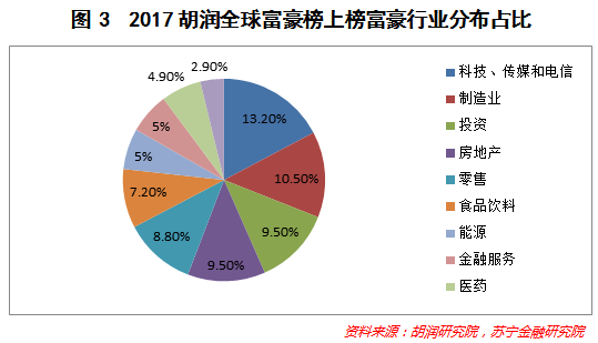 从上榜富豪所处行业看,科技、传媒和电信,制造业和投资业诞生全球十亿美金富豪的数量最多,分别为13.2%、10.5%、9.5%,合计占到总人数的三分之一(参见图3)。