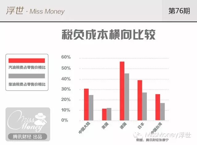 那30%左右的税负成本是高还是低呢?中国石油经济技术研究院曾发布汽油税费占零售价格的比例数据,中国大陆为30.46%,美国11.22%,德国56.92%,日本39.30%,中国台湾26.31%;柴油税费占最终零售价格的比例是:中国大陆26.31% ,美国11.87% ,德国为45.62% ,日本为27.35%,中国台湾为16.96%。可见中国大陆油价中的税负还是要高于美国等国家,也高于中国台湾地区。