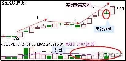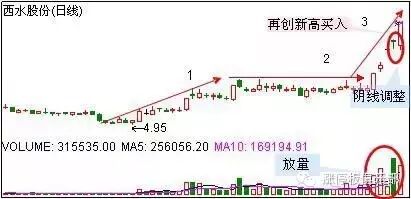 三、出现阴线调整后,再创新高时择机买入。如“少年股神”操作的香江控股和西水股份,都处于3浪主胜行情中,加速飙升后出现阴线回调,随后再度上攻,成功突破前日高点,形成一个超级短线买点。