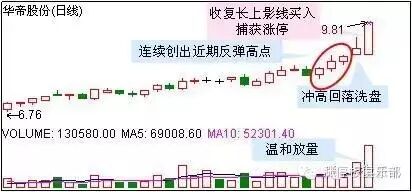 三、当股价攻破长上影阳K线高点后,伺机买入。主力成功洗盘后,次日开盘即快速拉升,盘中成功攻破长上影线高点后,就是绝佳买入时机。如华帝股份,上周四早盘冲高回落后,给人一种短线调整的感觉,而次日低开后即快速翻红,并再创近期新高,这就是绝佳的买入时机。