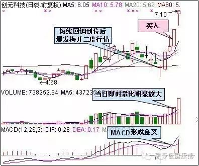 三、股价向上突破平台整理,5日均线与10日均线分离,确立买点。主力洗盘结束后,筹码仅一步集中,主力往往会借助利好进行二次拉升。一旦股价形成突破后,5日均线会再度向上,与10日均线重新分离,这个时候就是二次行情的启动点,也是我们的最佳买点,往往有较大概率捕获涨停。