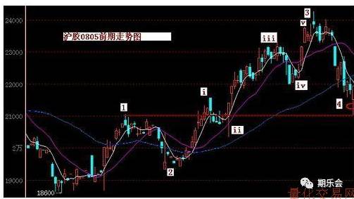 再看上图,这是沪胶0805在07年底的一段走势图。图中可以明显的标注出大浪级别的1、2、3、4浪。其中,第三浪是延长浪。图中最后一个K线处于一个关键位置。依照浪形规则,第四浪不会进入第一浪的价格领地。那么第一浪的高点之下一个点位就构成一个较好的支撑点位。如果我此时做多,请不要批评我逆势而为,因为我有一个做多的较好的关键价格点位止损,就算我看错了,我也会在很小的价格空间中止损出局,不会有太多的损失。我没有任何事后诸葛亮的意思。上面两个图,我都没有将后续的走势画出来,因为后续走势本来对于现在就不是特别重要,重要的是你入场时,有没有找到一个让你满意的止损位。