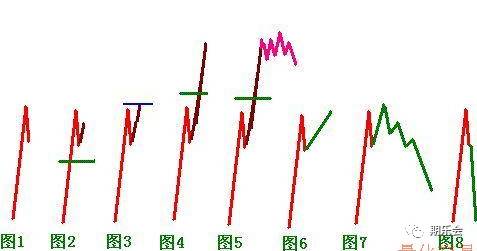 图6是第一式的一个失败图,其表现为上升速度明显被改变了,当然你也可以依照你的看法追多,毕竟趋势还是向上的,但这与我所写的第一式不是一回事了。图7是另一种失败图,你的多单恰好在最高点位成交,不要为此恼火,这是正常的,此时接受亏损,如果你能长期很好的运用此式的话,这点亏损是微不足道的。图8是很少见的一种失败图。价格呈现尖锐V字形反转,此时你应该只下出去了止损单,而开仓单还没有下出去,对你来说不会造成任何实际的损失。