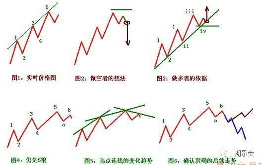 不过,请各位再看看图4与图1没有什么区别,但是我认为,这是两个绝缘不同的走势图。图1中1、3、5浪高点形成一条直线,说明上升通道保持良好,此时轻易否认这条通道的看法显得有些逆势而为。但图5中对图4的走势高点做了一个连线,各位可以看到,每一次将相邻高点连起来,就看到了一条更为平坦的趋势线,但这三条趋势线被看到之后,你应该想到,上升趋势正在慢慢的改变,前期多单应该慢慢考虑出局。可以像上图的图2一样选择做空。图6是对图5后续走势的一种预想图,如果后续向上,也是可以的,那么前期的上升5浪成为大一浪级别的上升第一浪,前期的回调三浪形成了大一浪级别的回调2浪。如果后续走出下降趋势,那么其c浪应该由5浪驱动形成,会有较大跌幅。