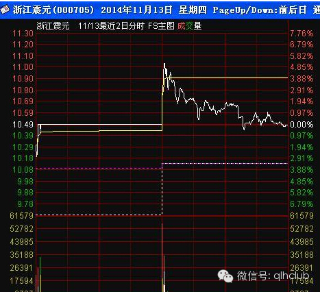图1:浙江震元涨停次日,虽价格在白虚线之上,但上冲后很快跌落黄线之下,且无讯号提示,根本不值得再观察。