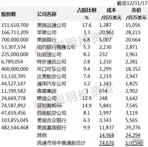 截至2017年年底,伯克希尔·哈撒韦公司共持有价值1705.4亿美元的股票。其中富国银行为其第一重仓股,持股482,544,468股,市值达到292.76亿美元,占该公司总股本的9.9%。
