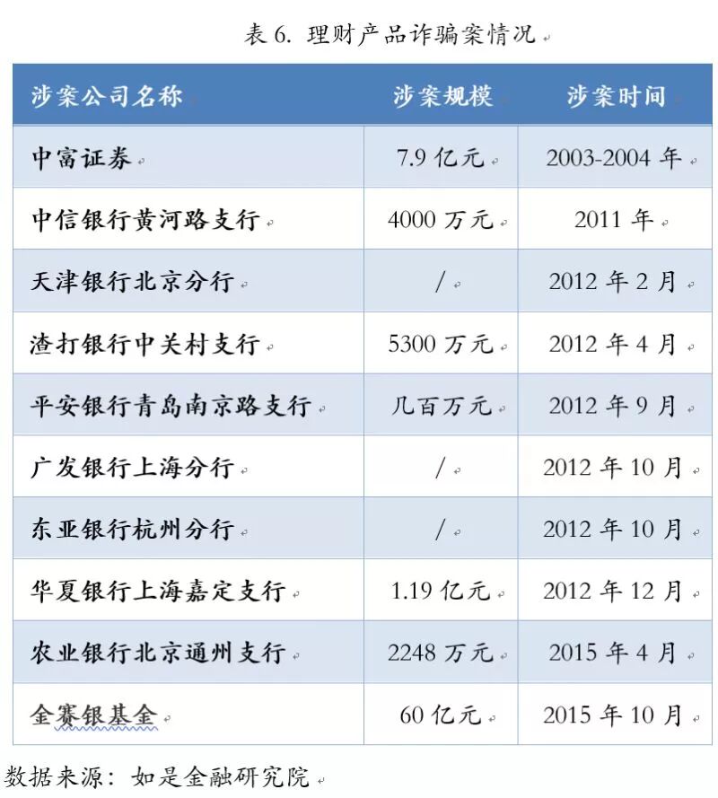 其中涉案规模最大,最为引人注目的是金赛银基金事件。2015年10月,深圳金赛银基金管理有限公司陷入60亿元兑付危机中,金赛银负责人王维奇跑路,客户的几十亿资金无处追讨,无处申诉;而平安人寿被曝由其业务员向客户兜售的巨额金赛银理财产品无法兑付。通过高档豪华会所装门面、拉拢政府官员打着政府项目的旗号推销、打平安保险担保的幌子、宣传公司挂牌上海股交中心等方式,金赛银公司吸引了大量投资者购买其理财产品,但这些钱实则进入了王维奇的个人私款。