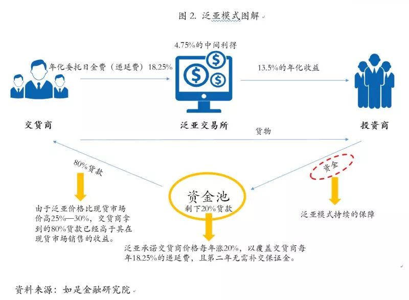 在交易所非法集资案件中,涉案规模和影响最大的是昆明泛亚有色金属交易所。昆明泛亚通过金属现货投资和贸易平台,自买自卖,操控平台价格,维持泛亚的价格比现货市场价高25%—30%,每年上涨约20%,制造交易火爆的假象,然后借此包装所谓“日金宝”等诱人的高收益产品。但实际上每年涨价20%只是为了让泛亚的价格永远高于现货市场价格,因此也永远不会有真正的买方,并没有带来实际增量资金;而交货商也因此不需补交保证金,投资者年化13.5%的日金宝理财收益,都是自己的本金或者新增投资者的本金。当新增资金放缓或者停止进入时,整个体系就会崩盘,投资者基本血本无归。