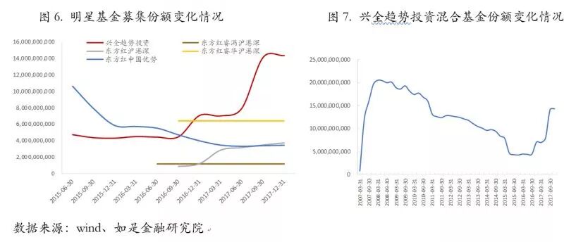 而一些正规投资渠道的项目或理财产品,往往不会存在反复融资的情况,大多会将融资规模控制在一定范围内。从图6列举的五只明星基金的募集份额情况来看,东方红睿满沪港深、东方红睿华沪港深、东方红沪港深、东方红中国优势的募集份额均维持得十分平稳,其中前两只基金的份额在成立以来均维持不变,东方红中国优势的份额甚至还有下降。兴全趋势投资混合基金的募集份额虽然在近两年来有较快的增长,但其募集份额规模较更早时候的2008年来看,也有明显的下滑;2008年3月31日,该基金的募集份额一度高达20536270957份。