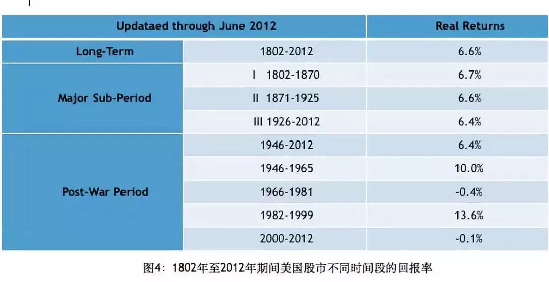 从图4我们可以看到,美国股市过去两百年平均回报率差不多是6.6%,每六十几年的回报率也差不多是这个数字,相对来说,比较稳定。可是当我们把时间放得更短一些的时候,你就会发现它的表现会很不一样。例如战后从1946年到1965年,美国股市的平均回报率是10%,比长期的要高很多。可是在下面的15年里,1966-1981年,不仅没有增长,而且连续15年价值都在跌。在接下来的16年里,1982-1999年,又以更高的速度,13.6%的速度在增长。可是接下来的13年,又开始进入一个持续的下跌的程。整个13年的时间里,价值是在下跌的。所以才有凯恩斯著名的一句话:”In the long run we are all dead.” 毕竟每一个人的时间是有限的。