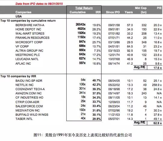 同期的或者早期的美国,一些公司大家也耳熟能详,伯克希尔Berkshire从1958年上市到现在涨了26000倍,IRR都是相当的,同时在美国上市的百度、携程,IRR增长最快的好几个都是中国公司(参见图11)。