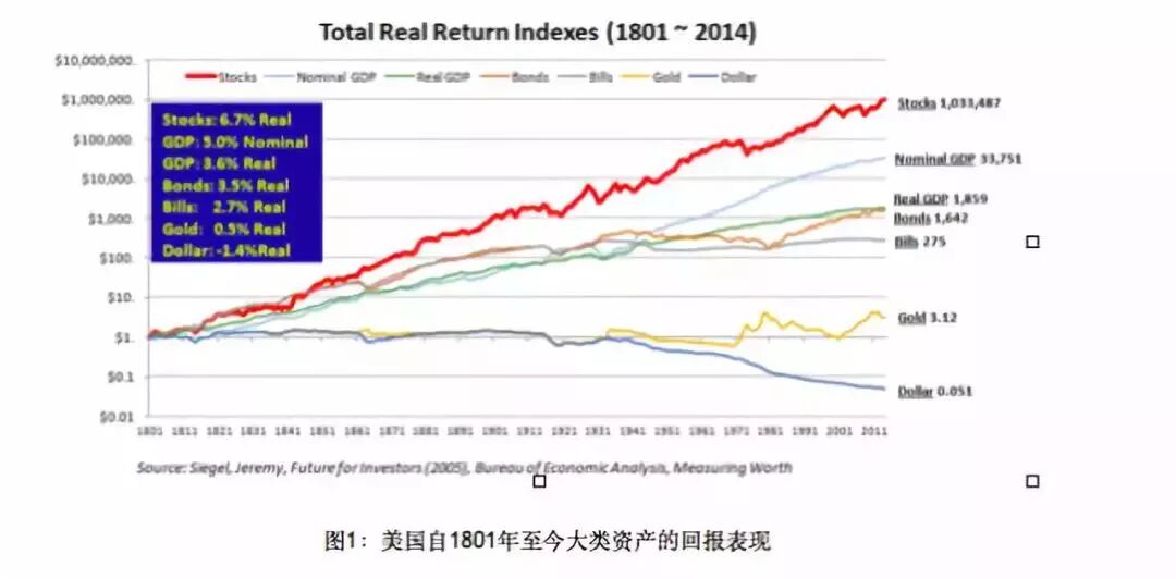 宾州大学沃顿商学院的西格尔教授(Seigel)在过去几十年里兢兢业业、认真地收集了美国在过去几百年里各个大类金融资产的表现,把它绘制成图表,给了我们非常可靠的数据来检验。这些数据可以可靠地回溯到1802年,今天我们就来看一下,在过去两百多年的时间里,各类资产表现如何呢?(见图1)